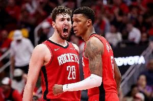 上半场比赛,火箭三分13中8(申京2中2、谢泼德小贾巴里和JD-戴维森皆3中2),老鹰三分15中8(特雷-杨、亚历山大-沃克和肯纳德皆3中2)。