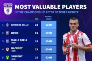 英冠最新身价前十:贝利斯、戴维斯2200万欧居首,伊镇4人在列